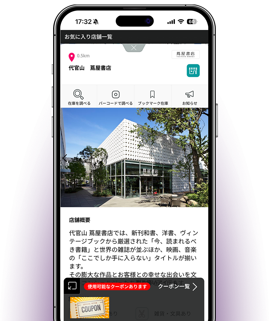 会社帰りにある店舗、ちょっと個性的な店舗、居心地の良い店舗など、お気に入りの店舗を登録しておくと、その店舗からクーポンなどのお得な情報が届きます。