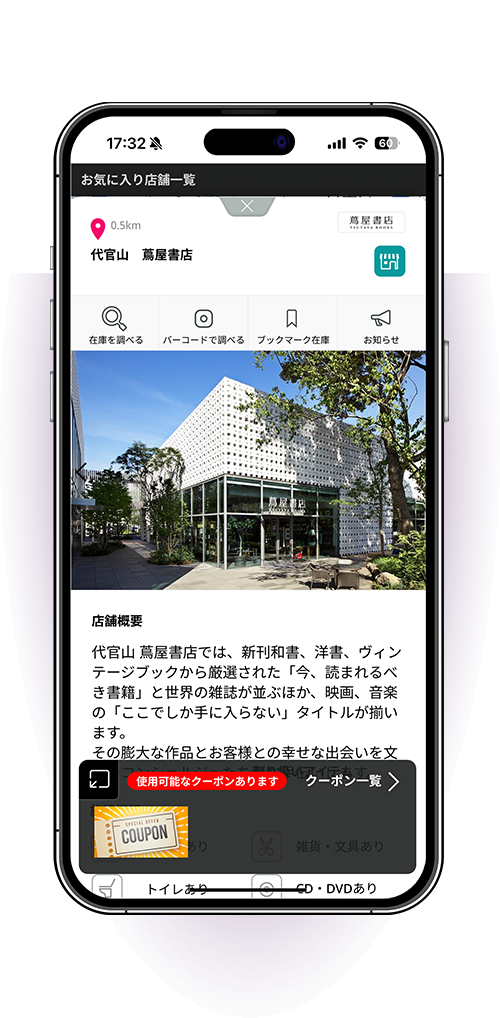 日々更新される書籍情報をもとに、あたなの関心事や注目の書籍をブックマークしてコレクション。それら書籍をまとめて、近隣店舗から在庫を調べることも可能に。比較検討したり、ユーザーレビューから自分に合う書籍を選ぶなど、使い方はあなた次第!