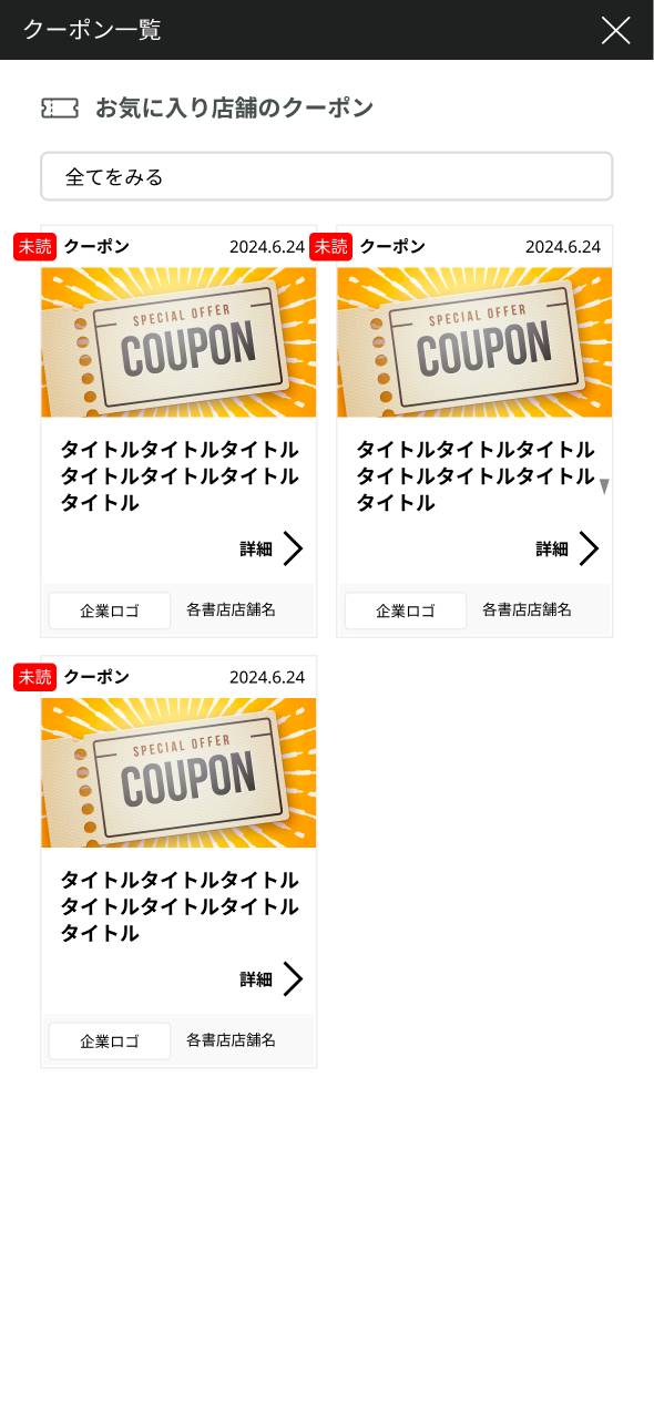 - お気に入り登録しているお店からクーポンが届き、利用可能なクーポンが一覧で表示されます。